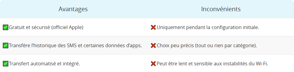 | ✅Gratuit et sécurisé (officiel Apple) | ❌Uniquement pendant la configuration initiale. |
