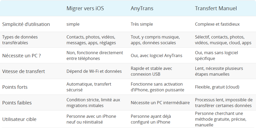 | Migrer vers iOS | AnyTrans | Transfert Manuel | |