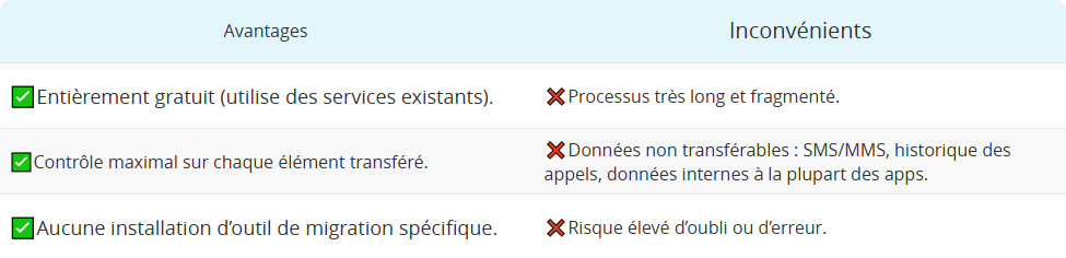 | ✅Contrôle maximal sur chaque élément transféré. | ❌Données non transférables : SMS/MMS, historique des appels, données internes à la plupart des apps. |