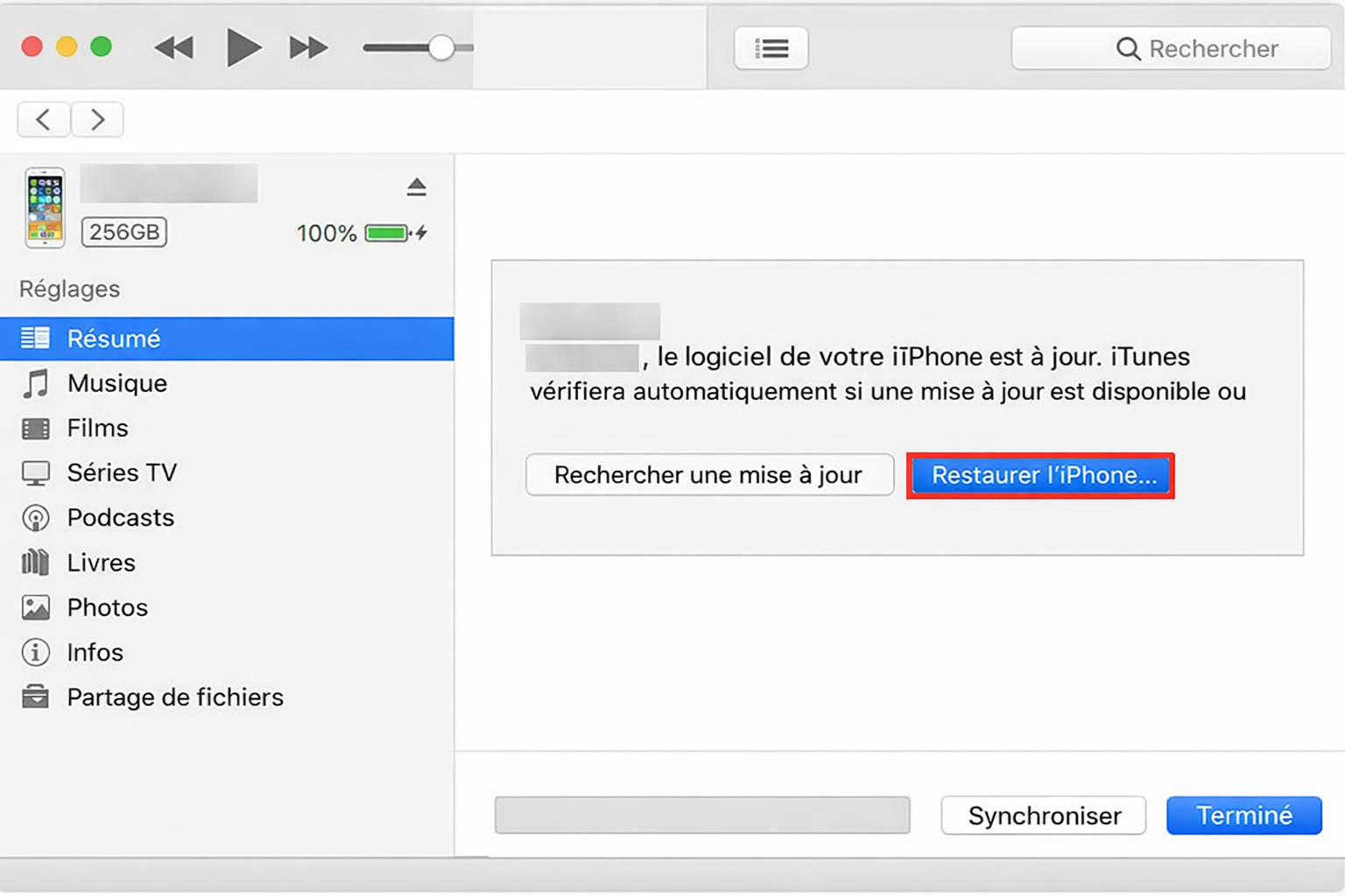 Cette méthode nécessite que la dernière version d’iTunes soit installée sur votre ordinateur. Notez également qu’elle effacera toutes les données de votre iPhone : photos, vidéos, applications et tous autres fichiers seront supprimés.