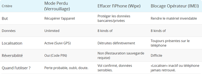 | Critère | Mode Perdu (Verrouillage) | Effacer l’iPhone (Wipe) | Blocage Opérateur (IMEI) |