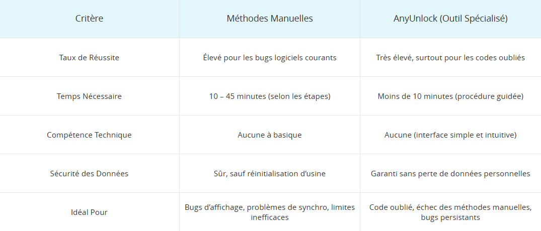 | Critère | Méthodes Manuelles | AnyUnlock (Outil Spécialisé) |