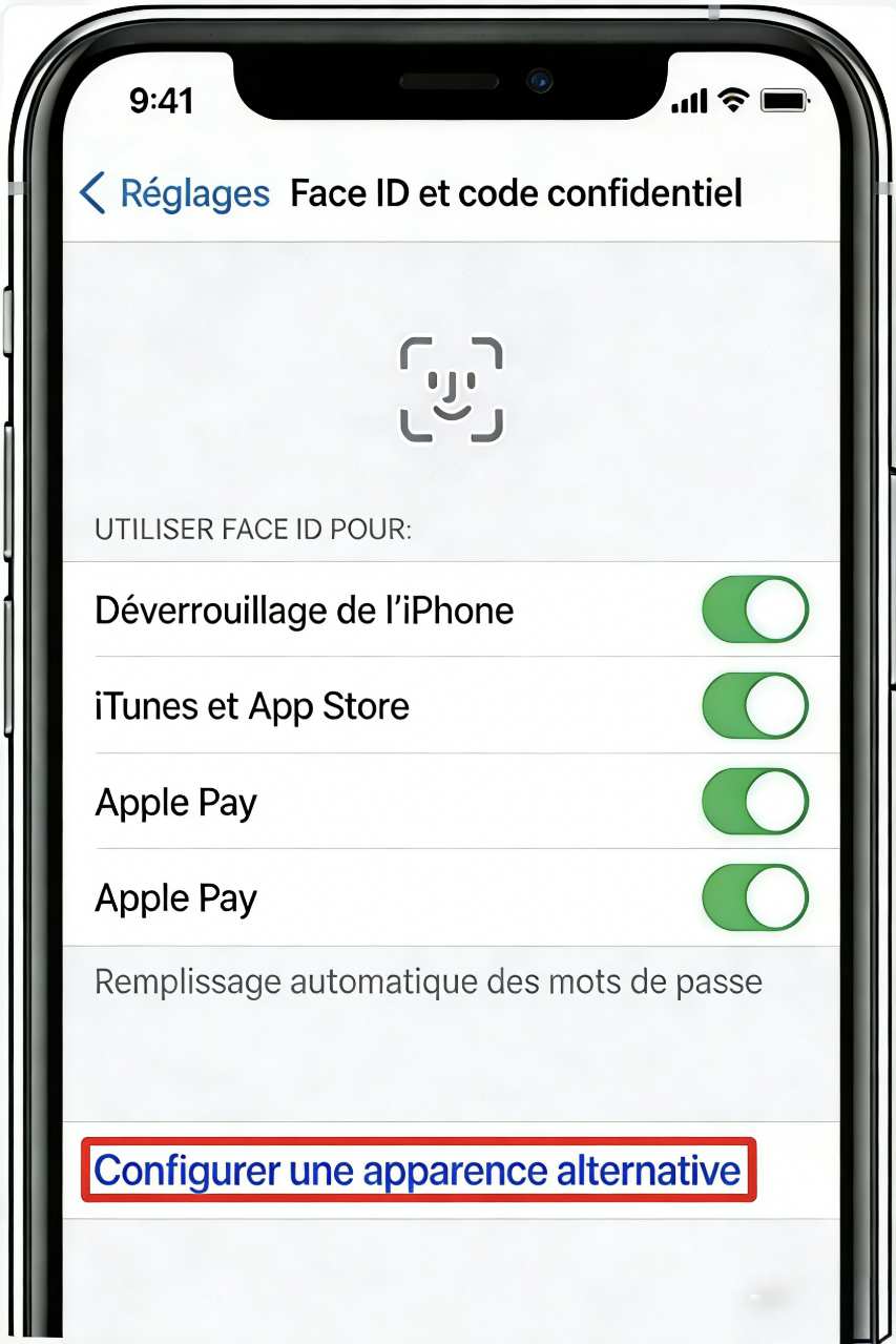 Votre visage change au quotidien — qu’il s’agisse de maquillage, de barbe ou de modifications subtiles. Ces changements peuvent empêcher Face ID de vous reconnaître, entraînant le message « Votre code est requis pour activer Face ID ». Ajouter une apparence alternative résout ce problème simplement.