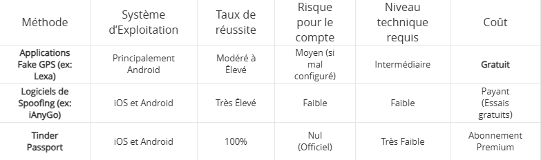 | Tinder Passport | iOS et Android | 100% | Nul (Officiel) | Très Faible | Abonnement Premium |