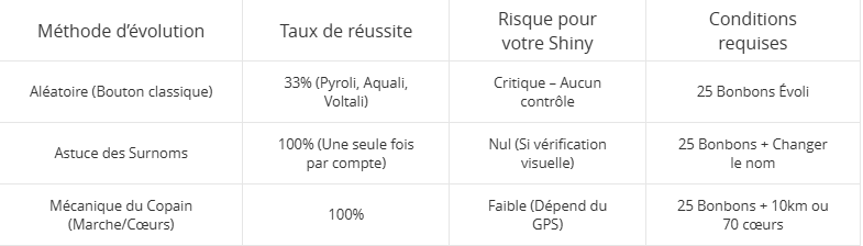 | Aléatoire (Bouton classique) | 33% (Pyroli, Aquali, Voltali) | Critique – Aucun contrôle | 25 Bonbons Évoli |