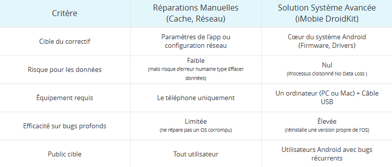 | Critère | Réparations Manuelles (Cache, Réseau) | Solution Système Avancée (iMobie DroidKit) |