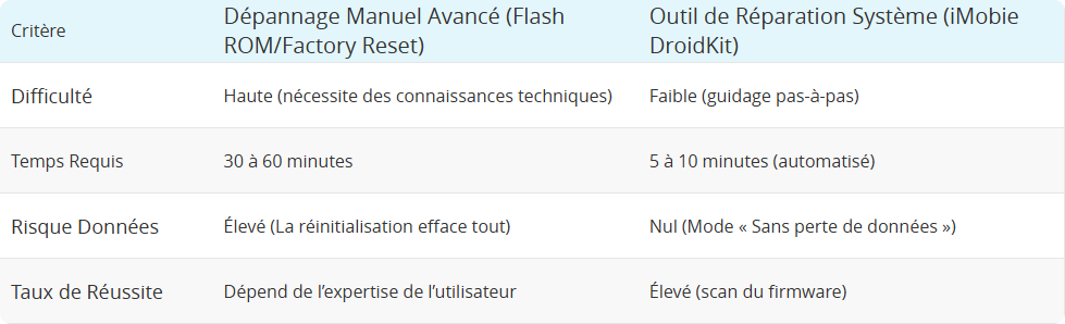 | Critère | Dépannage Manuel Avancé (Flash ROM/Factory Reset) | Outil de Réparation Système (iMobie DroidKit) |