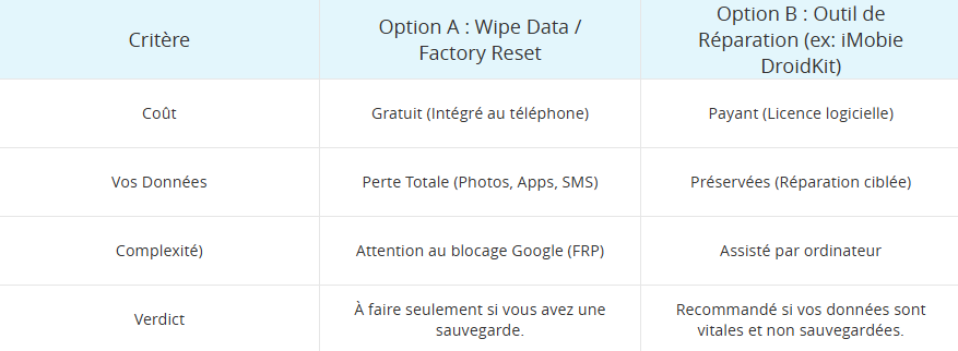 | Critère | Option A : Wipe Data / Factory Reset | Option B : Outil de Réparation (ex: iMobie DroidKit) |