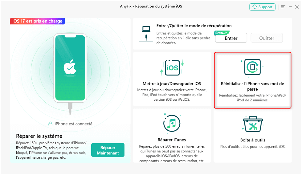 AnyFix va bien au-delà de la simple réinitialisation d’appareil : c’est un outil puissant de réparation du système iOS, qui a résolu avec succès des centaines de dysfonctionnements. Il corrige plus de 150 problèmes système, gère le mode de récupération en un clic, propose de rétrograder iOS sans iTunes et permet de réinitialiser votre iPhone sans mot de passe, le tout sans passer par iTunes.