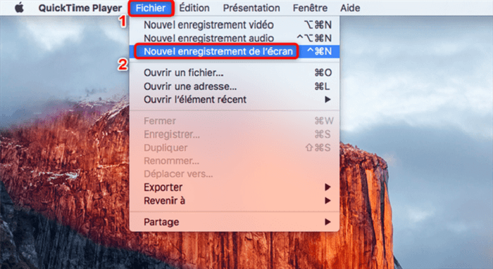 Sur l’écran de QuickTime, cliquez sur Fichier puis sur Nouvel enregistrement de l’écran.