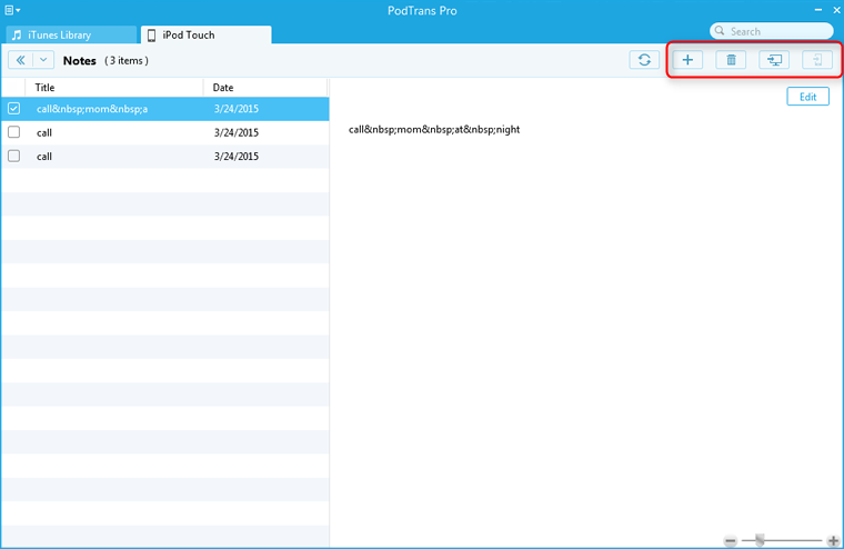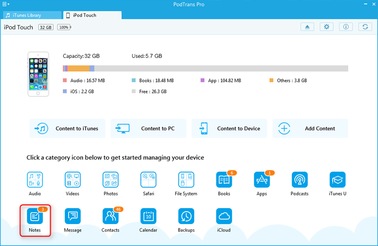 Step 1: Connect your iPod Touch to computer once logging in PodTrans Pro. Later, click Notes button to go on.