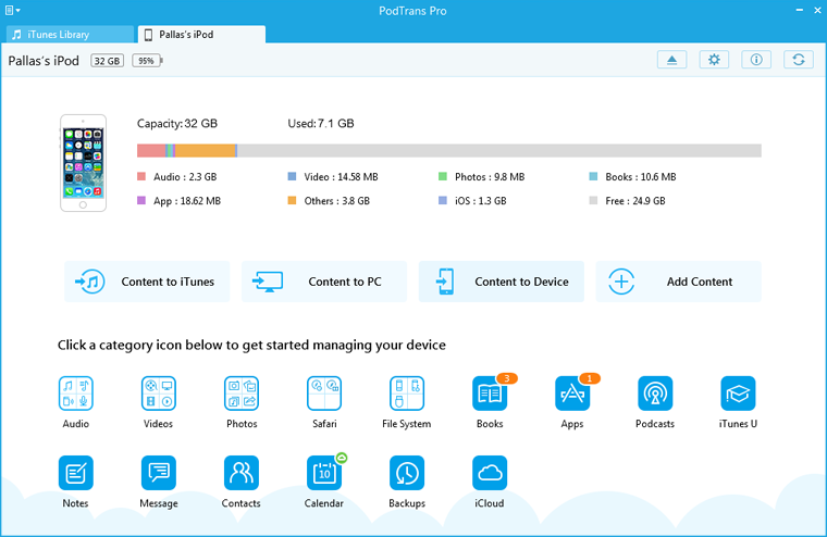 PodTrans Pro allows you to export iPod media files like music, video, iTunes U, books to iTunes, computer, and other iPod devices. Browse the image below, you can see various kinds of files. Just choose you wanted items to begin sync process.