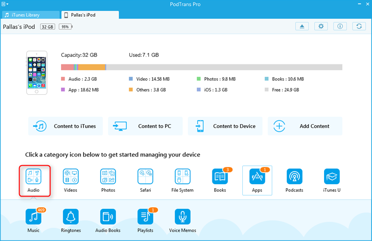 Step 1: Open PodTrans Pro, then click "Audio" option on the interface to choose music.