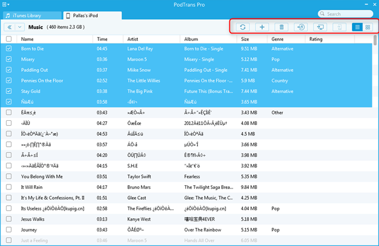 Step 2: When you pick up one or more music from this interface, you can refresh, add, delete, and transfer them to iTunes, computer and device. Just click the corresponding buttons on the top-right corner. On this interface, if the music on your iPod is grayed out, and it indicates the music file does not exist.