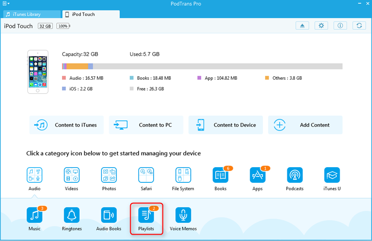 Step 1: Launching PodTrans Pro after connecting your device to the computer. Then, click "Audio" button and you can see the "Playlists".