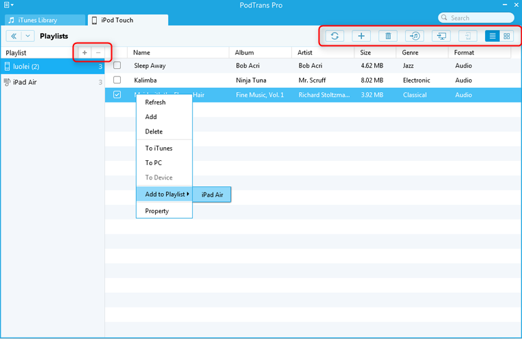 Step 2: The playlists are displayed on the left part of PodTrans Pro and with options of adding and deleting. If you want to edit the playlist, please right-click the target one. On the right part, the songs are able to refresh, add, delete, to iTunes, to computer, to iPod device. Right-clicking one or more songs, you can add the present song to another Playlist.