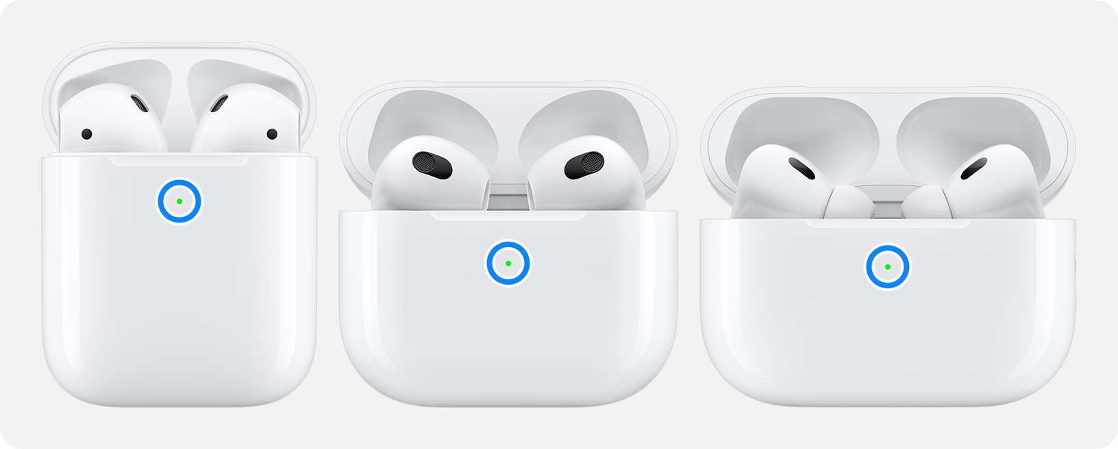 充電ケースの蓋を開けて、AirPodsのモデルに応じ、次の手順をします。