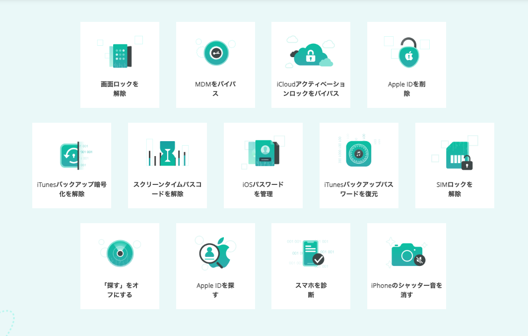 AnyUnlockは、iOSデバイスを様々なロックから快適に解放できるソフトで、 iPhone画面ロック、MDMロックのバイパス、iCloudアクティベーションロック、Apple ID、SIMロック、iTunesバックアップロック、スクリーンタイムパスコードなど様々なロックの解除に対応します。