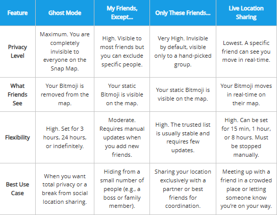 | What Friends See | Your Bitmoji is removed from the map. | Your static Bitmoji is visible on the map. | Your static Bitmoji is visible on the map. | Your Bitmoji moves in real-time on their map. |
