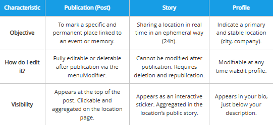 | Objective | To mark a specific and permanent place linked to an event or memory. | Sharing a location in real time in an ephemeral way (24h). | Indicate a primary and stable location (city, company). |