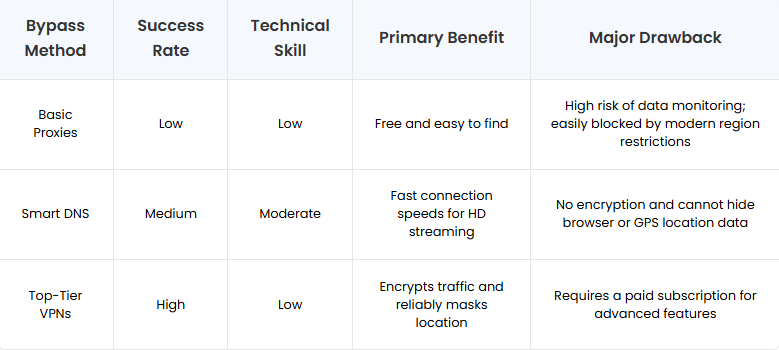 When figuring out how to access geo-blocked content, you will encounter a mix of free tools and professional software. Let us compare the most common options based on success rate, technical requirements, and overall safety.
