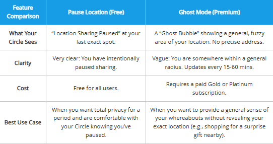 Pausing (free) completely stops location updates and shows a “Paused” status at your last known spot. Ghost Mode (premium) shows a general, approximate area of your location (a “Ghost Bubble”) instead of your precise spot.