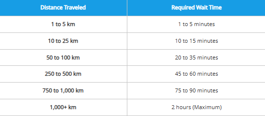 Wait times are strictly dictated by distance. They range from 1 minute for a 1 km jump, up to a maximum cap of 2 hours for any distance exceeding 1,000 km.