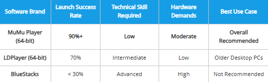 Currently, MuMu Player 11 (64-bit) offers the highest stability and easiest setup. LDPlayer is functional but frequently requires deeper manual configuration of virtualization settings.