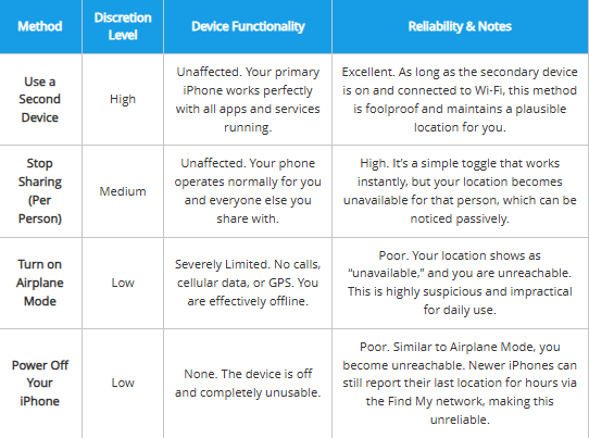 Choosing the right method for privacy depends entirely on your situation. Some techniques offer high discretion, while others are obvious and can raise more questions than they answer. Proper location services iPhone control requires understanding these trade-offs.