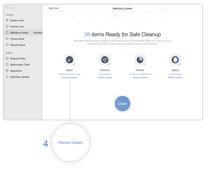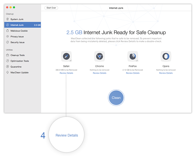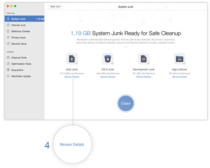 Step 3: After the scan completes, click “Review Details” ( 4 ) to check the breakdown of junk files and confirm the items you want to remove.