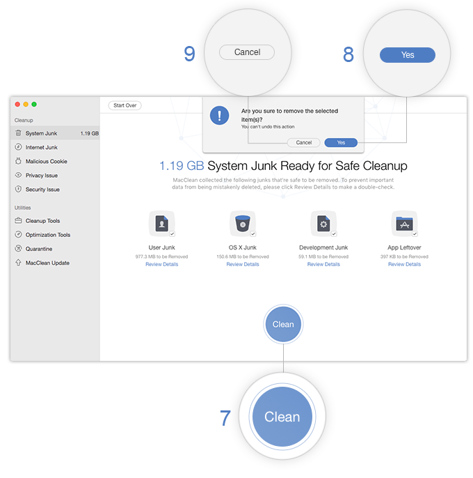 Step 4: Hit the “Clean” button, then confirm with “Yes” ( 8 ) to safely erase the selected system junk—no technical skills required.