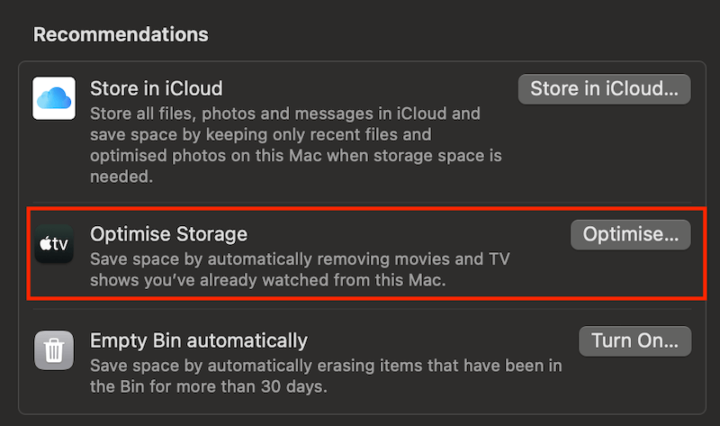 1) Go to Apple Menu > About This Mac > More Info > Storage Settings, toggle on “Optimize Storage” to automatically remove watched TV shows, email attachments, and old files. Also, consider turning on “Empty Bin automatically” and clearing the Downloads folder (use with caution, though).