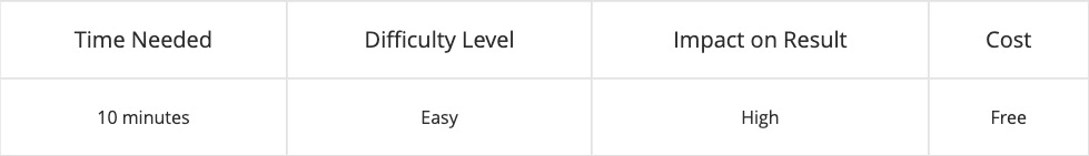 | Time Needed | Difficulty Level | Impact on Result | Cost |