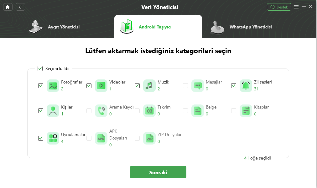 Adım 4. Veri türlerini seçebilir ve ardından aktarımı başlatmak için İleri’ye tıklayabilirsiniz.