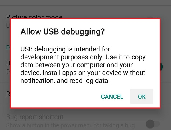 Adım5:Cihaz ekranında USB hata ayıklama izni isteyen bir bildirim görünecektir. “OK” seçeneğine dokunun.