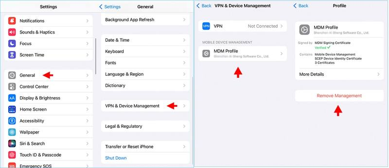 Adım3.MDM Profilini seçin>Yönetimi Kaldır’a dokunun.