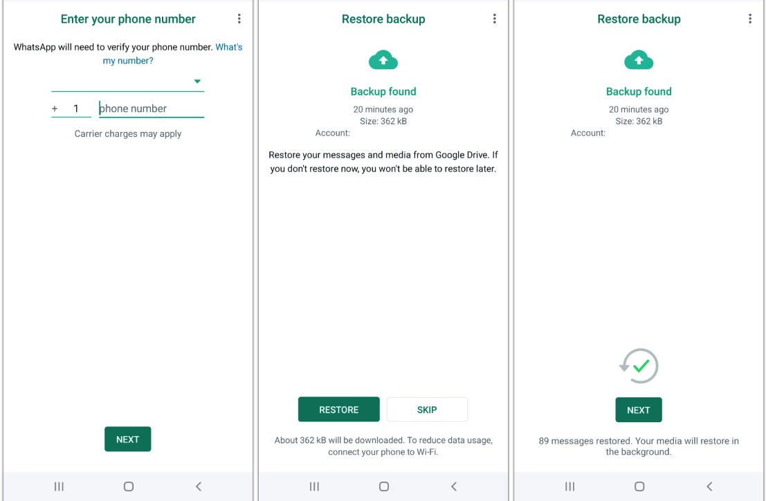 Adım2.Şimdi, WhatsApp’ı Play Store’dan yeniden yükleyin ve kurulumu başlatın. Telefon numaranızı girdiğinizde WhatsApp, yerel bir yedek dosyasının varlığını otomatik olarak algılayacaktır.